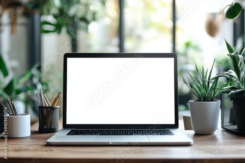 A blank screen laptop rests on a wooden desk, flanked by potted plants and office supplies. This well-lit workspace promotes creativity and productivity in a natural environment