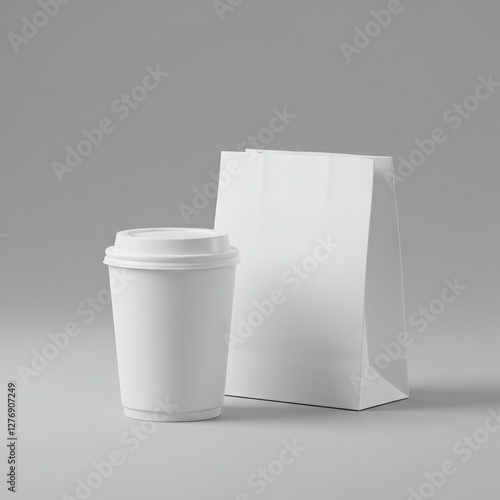 A blank white coffee cup and paper bag MOCKUP for branding design. An empty takeaway packaging template set on a gray background for a cafe logo.