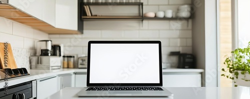 A blank white screen on a laptop in a bright, modern kitchen, with sleek appliances and minimalist design, captured in a clean, contemporary photo style