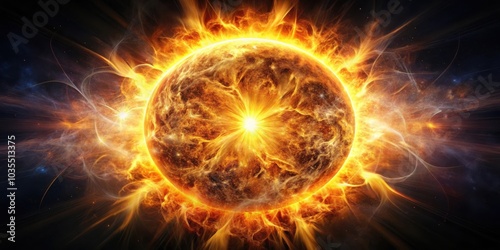 A blazing celestial sphere erupts with fiery energy, casting streaks of light across the cosmos.