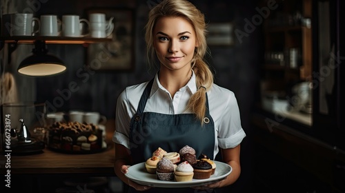 A blond woman standing in a kitchen, holding a plate filled with desserts and cupcakes. She wears an apron, as she is preparing to serve. The scene conveys a sense of warmth and hospitality.