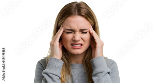 A blonde woman with a headache holding her temples in distress against a white studio background shot