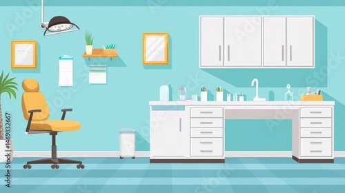 A blue and white office space with a yellow chair and a desk with a computer monitor and keyboard.