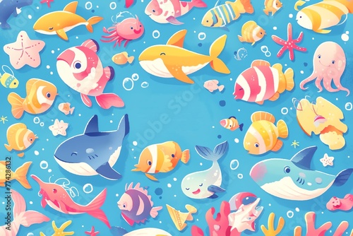 shark, star, whale, dolphin, seahorse, graphic, life, drawing, starfish, isolated, underwater, funny, illustration, baby, cartoon, ocean, set, collection, element, art, aquarium, marin, cute, blue, character, coral, nautical, animal, banner, design, poster, wildlife, octopus, aquatic, colourful, tropical, decoration, exotic, fish, water, icon, shell, nature, sea, background, jellyfish, summer, fauna, crab