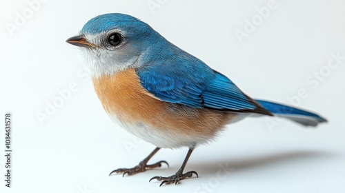 a blue bird standing on a white surface