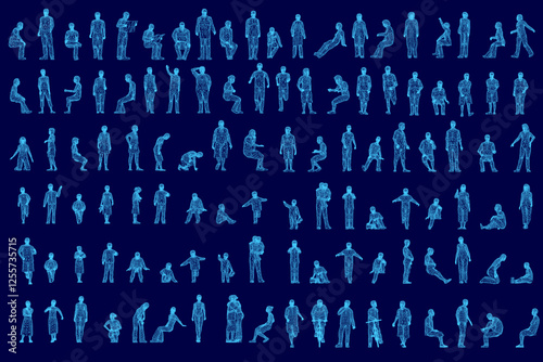 people, many, various, set, blue, pose, collection, position, wireframe, different, standing, other, sitting, movement, vector, activity, silhouette, illustration, man, female, woman, sport, male, human, family, walking, background, children, group, football, girl, fashion, action, lady, symbol, boy, couple, fitness, business, outline, dancer, team, dance, simple, crowd, design, jump, friends, adult