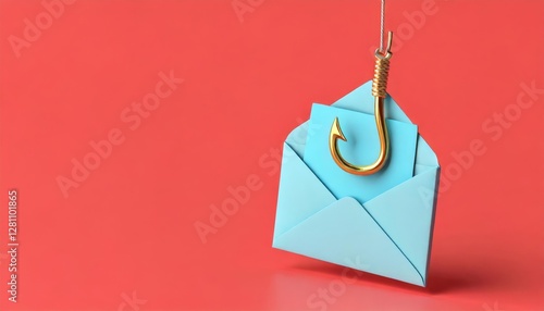 A blue paper envelope with a golden fishhook attached, symbolizing phishing or online scams, set against a vibrant red background.