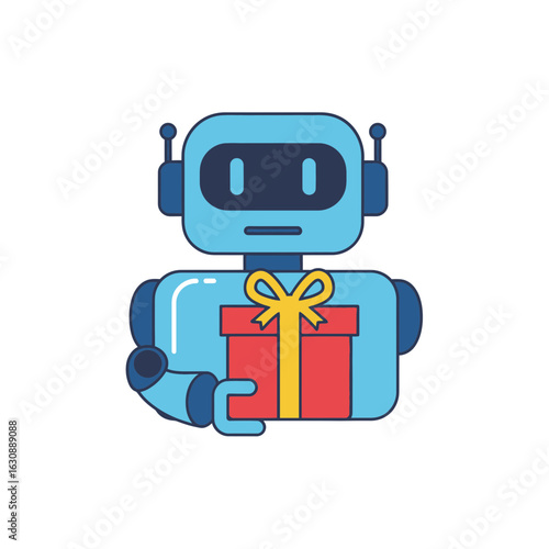 A blue robot holds a red gift box tied with a yellow ribbon.