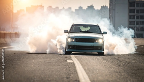 automobile, smoke, asphalt, road, burnout, wheel, tire, drifting, speed, motion, power, engine, performance, urban, city, concrete, light, sun, sky, horizon, heat, thrill, excitement, driving, fast, movement, vapour, pollution, car, front, angle, action, automotive, street, grey, white, blur, dust, cloud, summer, daytime, outdoors, sunlight, vehicle, transportation, modern, sport, racing, drift