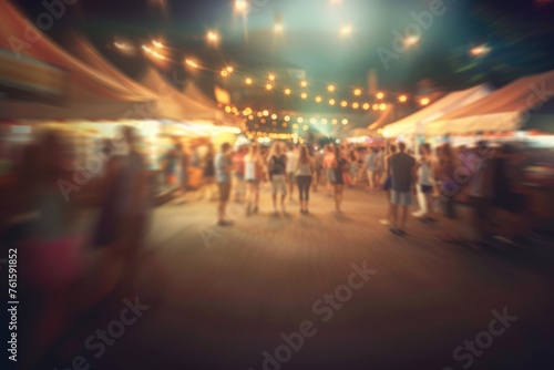 a blurry photo of people walking around a fairground at night with lights on the ceiling and a tent in the background with people walking around.