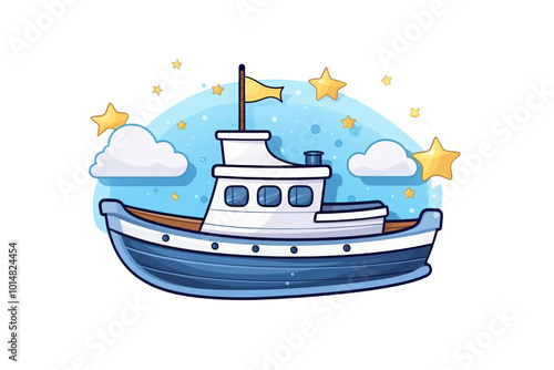 A boat with a yellow star, clouds, stars, and blue sky is perfect for summer vacation brochures or nautical themed designs. Generative AI