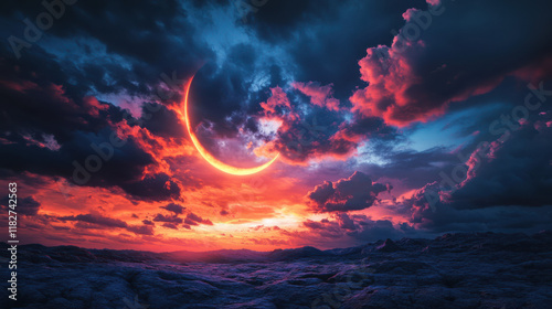 A bold, atmospheric scene of a crescent moon glowing in a deep cobalt and amber dusk sky, framed by dramatic storm clouds tinged with hints of orange and red. The moonlight streams through the clouds