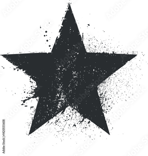 A bold black star design with a grunge texture and splatter effects for artistic use.
