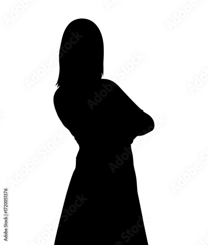 woman, female, businesswoman, business, professional, confident, determined, arms crossed, silhouette, black-and-white, monochrome, modern, contemporary, poised, ready, leadership, success, motivation, power, style, fashion, design element, graphic, vector, illustration, portrait, adult, office, corporate, black, people, person, body, beauty, profile, dance, dress, shadow, model, pose, face