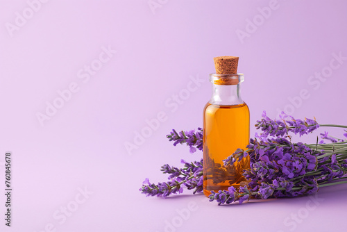 A bottle of essential oil with fresh lavender twigs on violet background. Essential Aromatic oil, lavender flowers. Aromatherapy, skincare cosmetics products, alternative medicine and perfumery