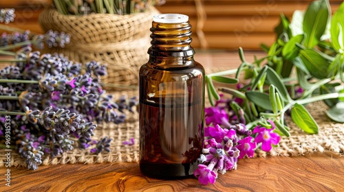 A bottle of lavender essential oil sits on the table