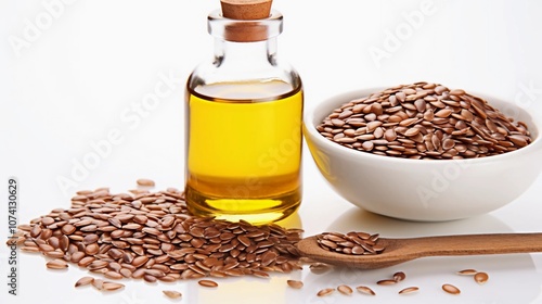 A bottle of oil next to a bowl of flaxseeds, showcasing healthy cooking ingredients.