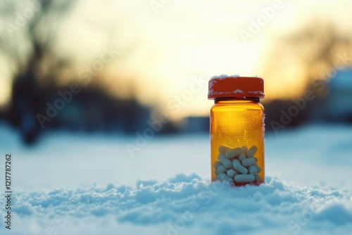a bottle of pills, standing up in the snow on the ground