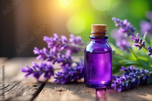 A bottle of pure lavender essential oil sits on a rustic wooden table, surrounded by fresh lavender sprigs Sunlight streams in, illuminating the calming purple hues , flowers, aromatherapy, therapy