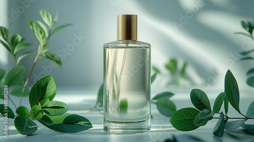 A bottle of white perfume, stands tall and elegant against a pristine white background. The gold cap is centered above the body, which contains clear glass that reflects light beautifully. Small green