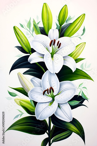 bouquet, white, lily, green, leaf, background, lily, flower, art, painting, botanical, nature, floral, illustration, botanic, beautiful, bud, greenery, stem, digital, artwork, stem, rendered, realistic, style, full, bloom, flower petals, open, wide, stamen, pointing, upwards, flower, surrounded, bud, long, slender, footed, light, pink, colours, racked, out, elegant, delicate