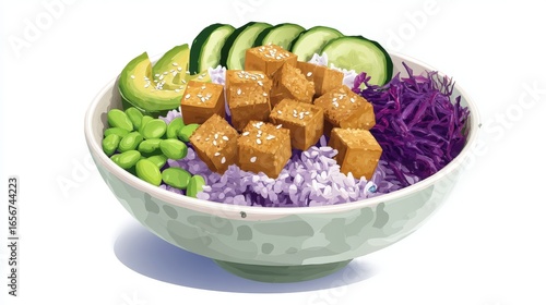 bowl, rice, tofu, cube, avocado, cucumber, slice, cabbage, purple, shredded, food, dish, meal, healthy, nourishment, vegetarian, vegan, plant, based, diet, cookery, fresh, ingredient, delicious, tasty, balanced, portion, serving, lunch, dinner, snack, culinary, epicure, presentation, style, arrangement, vibrant, colourful
