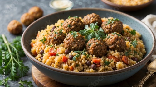 couscous, lentil, meatball, bowl, herb, fresh, food, meal, healthy, mediterranean, spice, savoury, nourishment, dish, culinary, cookery, grain, legume, protein, garnish, traditional, homemade, organic, vegetable, aromatic, balanced, diet, receipe, texture, delicious, wholesome, epicure, cooked, comfort, vibrant, ethnic, simple, hearty, serving, natural, plate, flavorful, dining, tasty, chef, alimentary