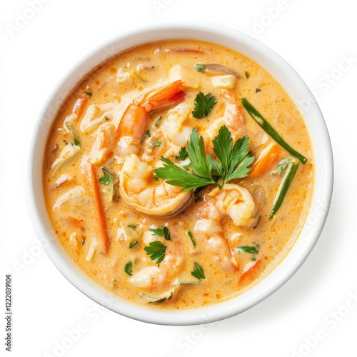 bowl, creamy, coconut, curry, shrimp, vegetable, isolated, white, background, minimalist, art, style, flat, photo, front, view, rich, sauce, resolution, rice
