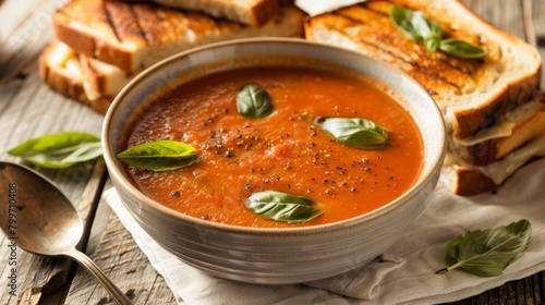 A bowl of creamy tomato soup with floating basil leaves, served with a grilled cheese sandwich for a comforting meal.