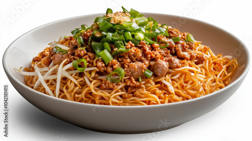noodle, minced meat, green onion, bean sprouts, flavorful, bowl, vibrant, appetising, meal, delicious, tasty, savoury, asian, cookery, broth, spicey, garnish, satisfying, comforting, hot, steamy, stir-fried, homemade, traditional, healthy, alimentary, quick, easy, deliciously, fresh, seasoned, aromatic, ramen, udon, vermicelli, soba, tofu, seafood, pork meat, chicken, beef, vegetable, scallion, cilantro, ginger