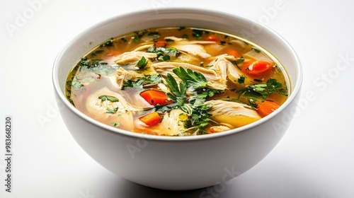 A bowl of hearty halal chicken soup with fresh herbs, set on a minimalistic white background, no logos.