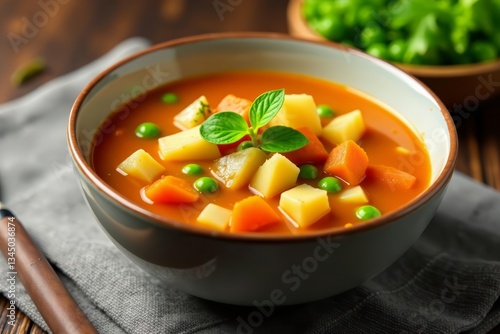 A bowl of hearty vegetable soup with chunks of carrots, potatoes, and peas, meal, white background