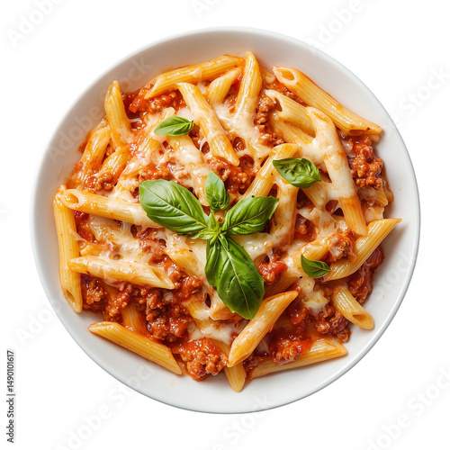 A bowl of penne pasta topped with meat sauce and melted cheese, garnished with fresh basil leaves. isolated on white background and transparent background