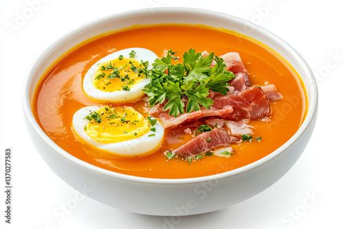 food, cookery, eating, closeup, ingredient, bowl, soup, tomato soup, prosciutto, white background