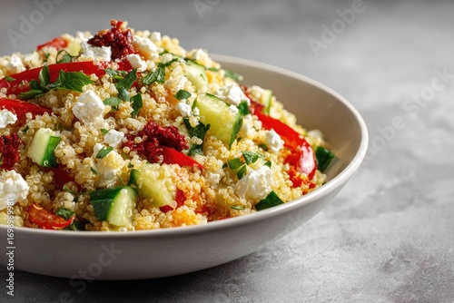 salad, bowl, food, healthy, delicious, fresh, mediterranean, vegetarian, vegan, light, dinner, lunch, grain, vegetable, cucumber, tomatoes, bell pepper, feta, herb, parsley, colourful, freshness, plate, dish, cookery, diet, nourishment, tasty, appetising, summer, meal, homemade, portion, balanced, protein, carb, fiber, ingredient, receipe, savoury, bright, eatery
