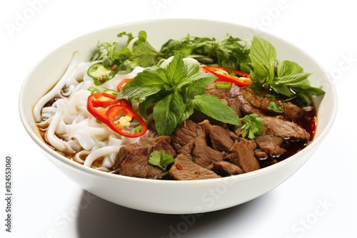 A bowl of Vietnamese pho with steaming broth and fresh herbs. White background.