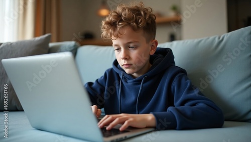 A boy in a navy hoodie uses a laptop on a light blue couch.