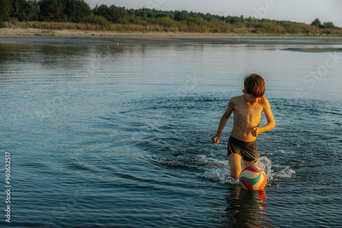 A boy plays with a colorful beach ball in shallow, calm water, creating a splash as he enjoys a sunny day near the shore. Trees and sand are visible in the background.