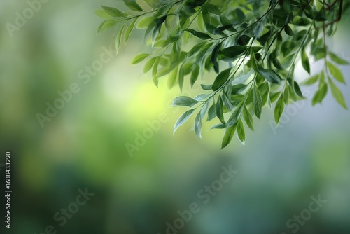 A branch of green leaves with light filtering through, set against a soft, blurred green and white background creating a serene, natural atmosphere