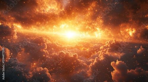 A breathtaking cosmic scene showcasing a radiant sun emerging from vibrant clouds, surrounded by glowing particles and an expansive universe.