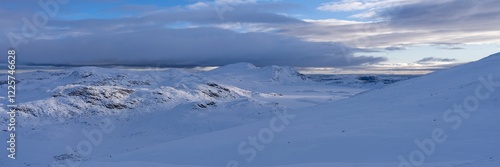 A breathtaking panoramic view of a snow-covered landscape, showcasing soft undulating hills and distant mountains. A serene winter atmosphere under a cloudy sky, creating a tranquil, untouched scene.