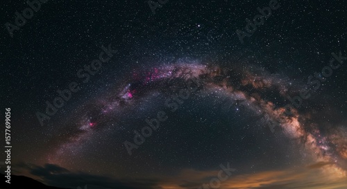 A breathtaking panoramic view of the Milky Way galaxy arching across a dark night sky, with vibrant colors and countless stars