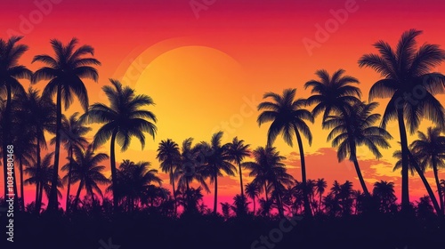 A breathtaking silhouette of lush palm trees against a vibrant tropical sunrise, with a colorful sky transitioning from deep orange to soft pink