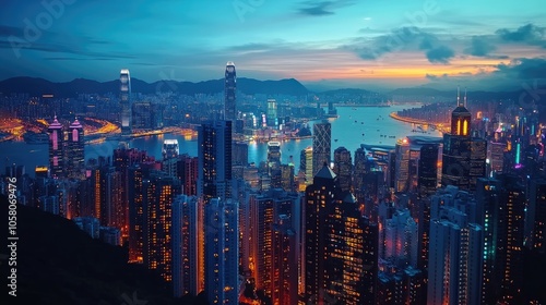 A breathtaking view of a city skyline at dusk, with skyscrapers illuminated against a blue and orange sky.