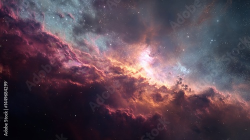 A breathtaking view of a nebula, swirling clouds of gas and dust illuminated by distant stars. Shades of pink, orange, and purple create a mesmerizing cosmic landscape.