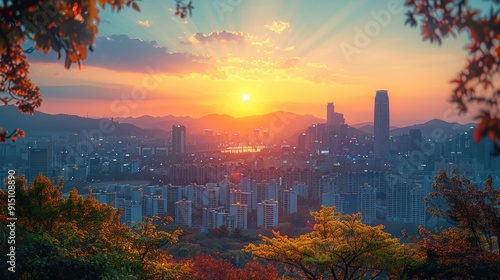 A breathtaking view of a sunset over a bustling city skyline, with vibrant colors illuminating the sky and urban landscape.