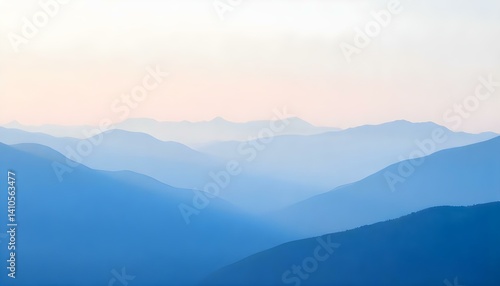 A breathtaking view of layered blue mountain ranges fading into the soft morning sky.