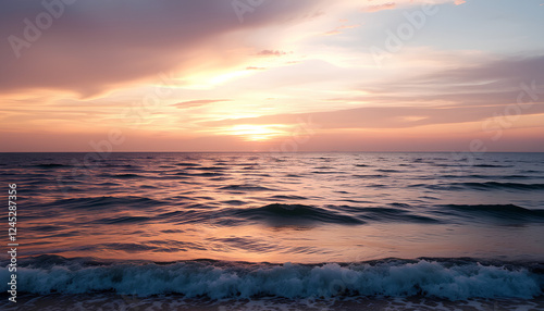 A breathtaking view of the ocean at sunset, with golden and pink hues reflecting on the calm waves