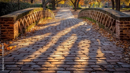 path, park, stone, bridge, brick, autumn, serene, scene, cobbled, red, fallen, leaves, decorative, pattern, side, curve, visitor, lush, tree, foliage, sunlight, long, shadow, warm, atmosphere, stone bridge, redbrick, autumn foliage