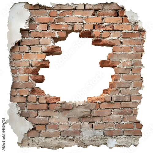 A brick wall with a hole in the middle isolated on white and transparent background. PNG cutout.